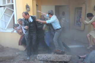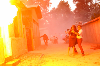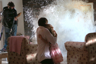 En el caso del devastador tsunami, que se recrea cuando el padre Reynaldo (Mario Horton) intenta salvar a la pequeña Eva en la destruida casa de los Sotomayor en Valdivia, se usaron tres mil litros de agua los que fueron lanzados a presión a través de un tobogán de cuatro metros de altura sostenido por una grúa.